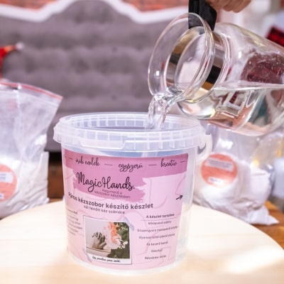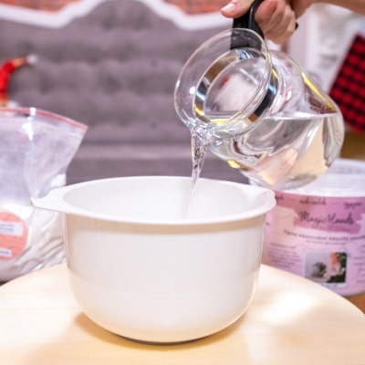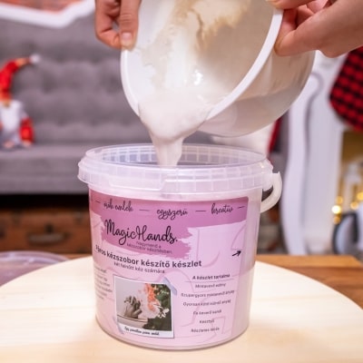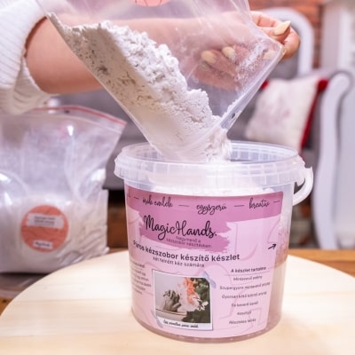 Odlévací prášek vsypeme do mísy. Pomocí přiložené rukavice hněteme rukama, dokud není hmota úplně bez hrudek.